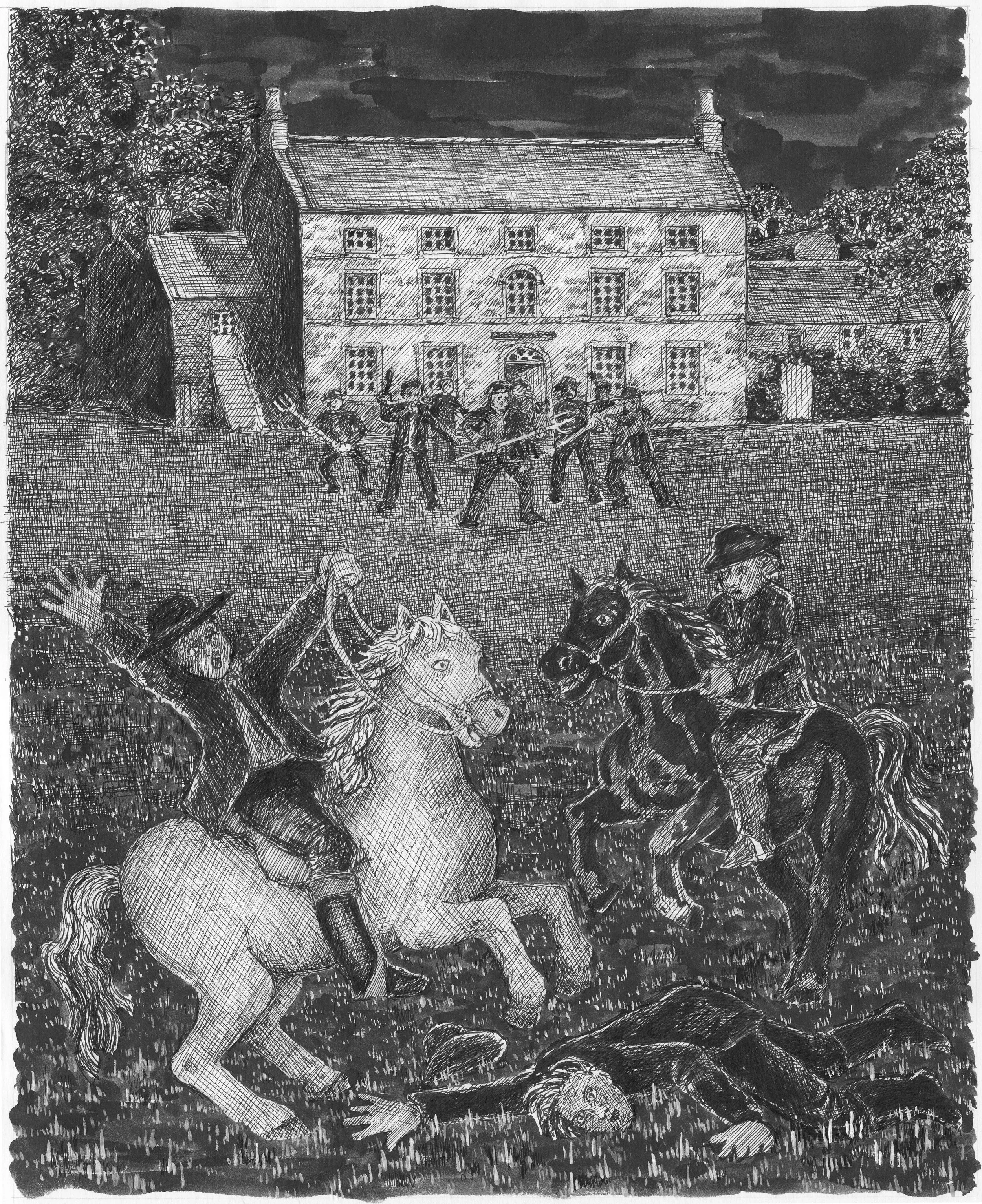 The pack was opened, revealing the body of a dead man inside wearing a silver whistle around his neck. It didn't take long for the servants to realise that the dead man had been smuggled inside the hall as part of a larger plot to burgle Lee Hall. The plan was obvious, this man was going to break free from his package, open the doors and sound the alarm for his fellow accomplices to ransack the household. After discussions about what to do with the body and how they would explain this to their master, it dawned upon the servants that this saga was far from over and that they were likely to be visited by the rest of the gang that very night. The servants did their best to summon help from neighbours and many local people came to Lee Hall, bringing with them their guns and pitchforks ready to defend the hall.